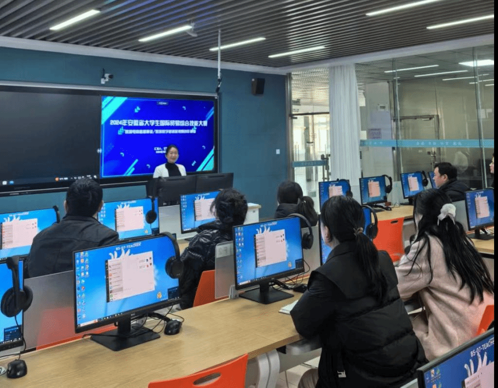 2024 年 3 月 7 日下午,外国语学院应用英语教研室教学能力提升活动之2024年安徽省大学生国际贸易综合技能大赛赛前培训会在逸夫楼B507跨境电商实训室举行。本次培训特邀福建亿学教育科技集团有限公司陈银红一行参加,由商务英语专业教研室主任赵娟主持,应用英语教研室成员和实训室管理员参加会议。