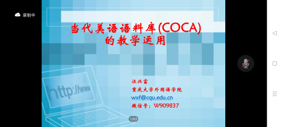 重庆大学汪兴富教授分享了“美国当代英语语料库(COCA)的教学运用”,该语料库是当今世界上最大的英语平衡语料库,为英语教学与研究提供了一个良好的平台。