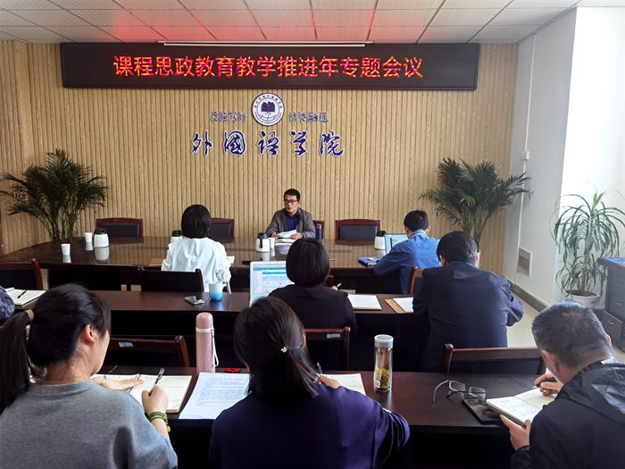 5月16日下午,外国语学院在逸夫楼A318召开了课程思政教育教学推进年专题会议,会议由外国语学院副院长胡永近主持,各教研室主任、科级干部和教学管理人员参会。
