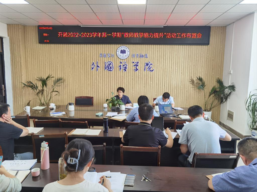 为落实宿州学院《关于开展2022-2023学年度第一学期“教师教学能力提升”活动的通知》,外国语学院于9月19日召开了2022-2023学年第一学期“教师教学能力提升”活动工作布置会。外国语学院领导、教研室主任及全体科级干部参加了会议,会议由院长张雁凌主持。