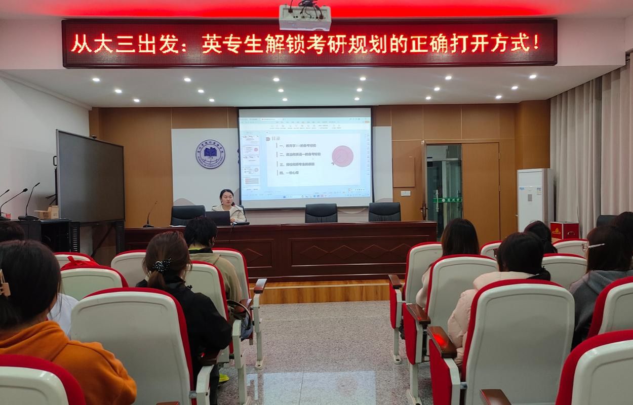 为帮助我院大三学生明确考研方向、科学规划备考路径,11月10日晚,辅导员杨哲在逸夫楼一楼会议室开展考研经验分享会,以“从大三出发:英专生解锁考研规划的正确打开方式”为主题,为在场的120余名大三学生带来实用的备考指导。