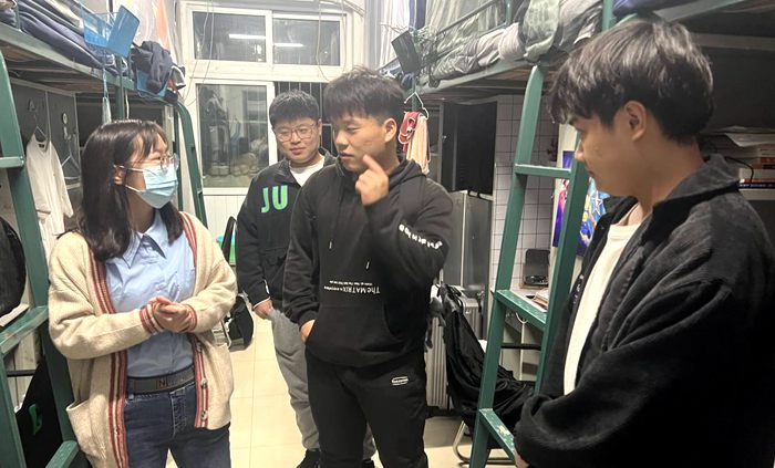 辅导员们每日都走访多个学生宿舍,深入了解学生疫情期间的学习、生活、心理状况,解释学校疫情防控相关规定和学校周边疫情发展形势,掌握学生思想动态,倾听学生内心想法,关注学生情绪变化,为学生解决实际困难。