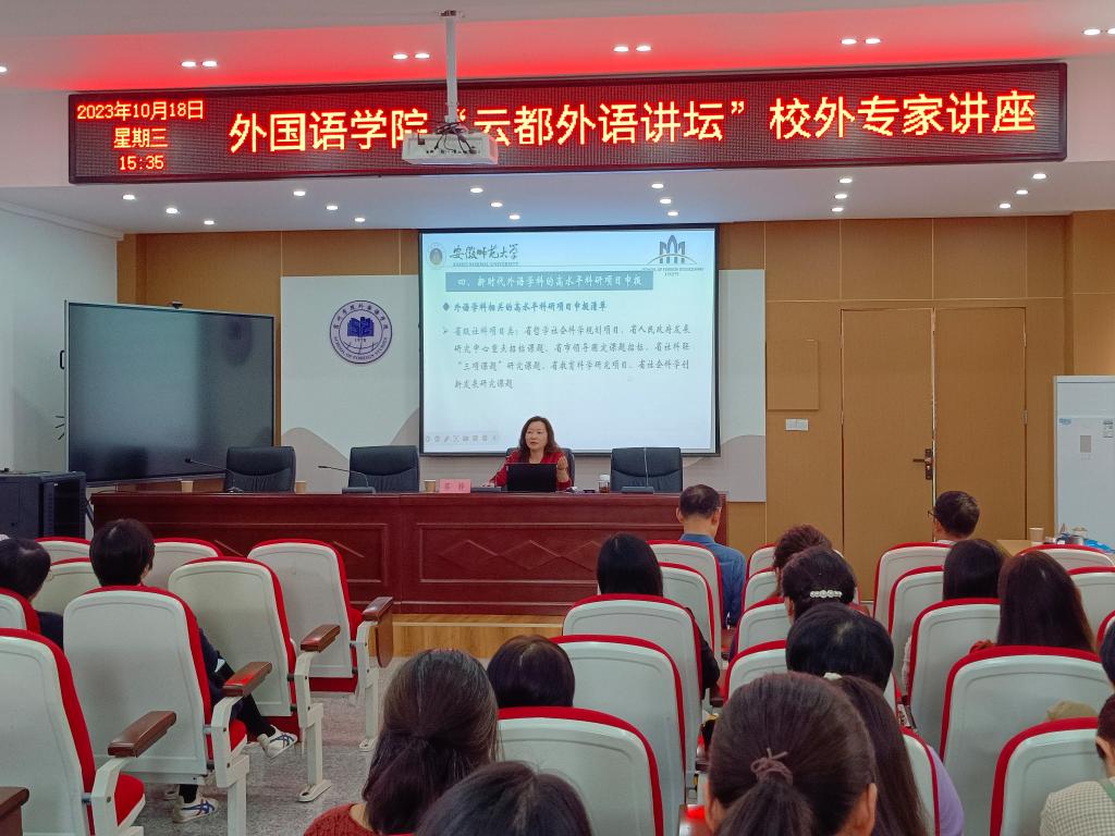 2023年10月18日下午,在外国语学院一楼会议室相继进行了两场热烈的“云都外语讲坛”讲座。外国语学院邀请了安徽师范大学外国语学院科研副院长、MTI硕士点负责人、硕士生导师蔡静教授作讲坛第九场讲座——“有组织的科研”与高级别项目申报,还邀请了韩国韩南大学名誉教授闵泳大先生作讲坛第十场讲座——中国——离韩国既近又远的国家。两场讲座由外国语学院科研副院长胡永近教授主持。