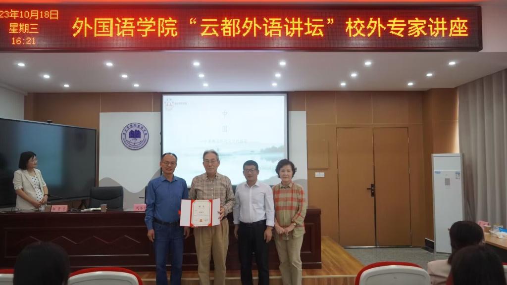 闵泳大教授结合个人的学习经历和学术生涯,分享了自己对中国文化的了解,以及对中韩古典文学研究的成果和感受,并坚定了自己退休后来到中国教授韩国语言、文化的决心,他呼吁师生们为中韩之间的文化交流贡献力量。外国语学院聘请闵泳大教授为我院客座教授,外国语学院党委书记郝景东为其颁发聘书。